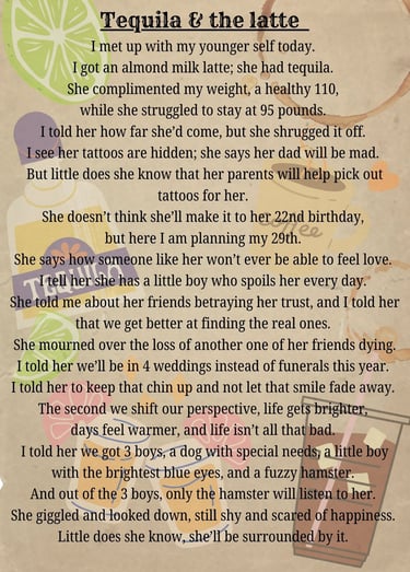 I write poetry rooted in transformation, in the before and after of becoming. My work explores addiction, identity, grief, healing, and the quiet resilience it takes to grow beyond the versions of ourselves we once thought wouldn’t survive. Through vivid imagery and emotional honesty, I tell stories of pain, perspective, and the unexpected softness that can follow both.